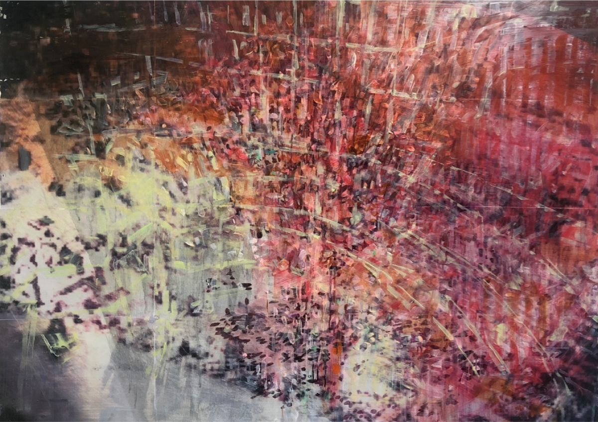 rupture I 2022, oil and photoprint on primed paper, 49 x 67cm